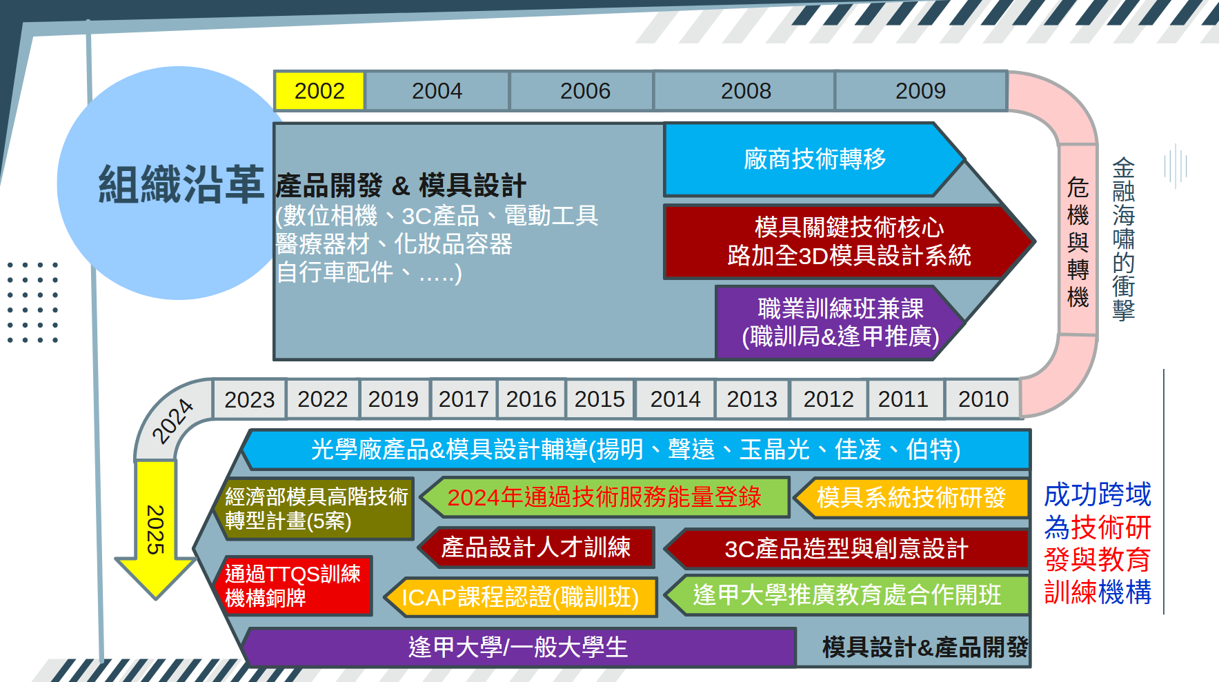 產品開發與模具設計為基礎,逐步推進關鍵技術核心與全 3D 模具設計系統,並展開技術轉移與職訓推廣。